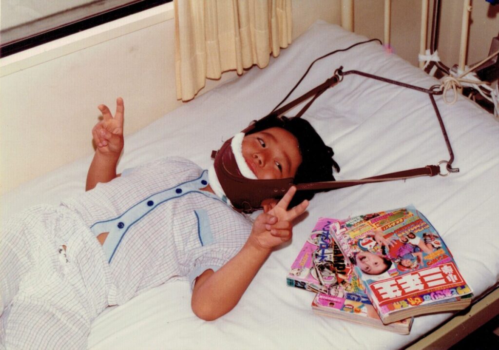 私も長年首の症状に苦しんだからこそ、正しい知識を持ってセルフケアに取り組んでほしいと思っています。写真は私が小学校1年生の時に頸椎ヘルニアで身動き取れなくなり、24時間牽引で数週間に渡り入院していた時のものです