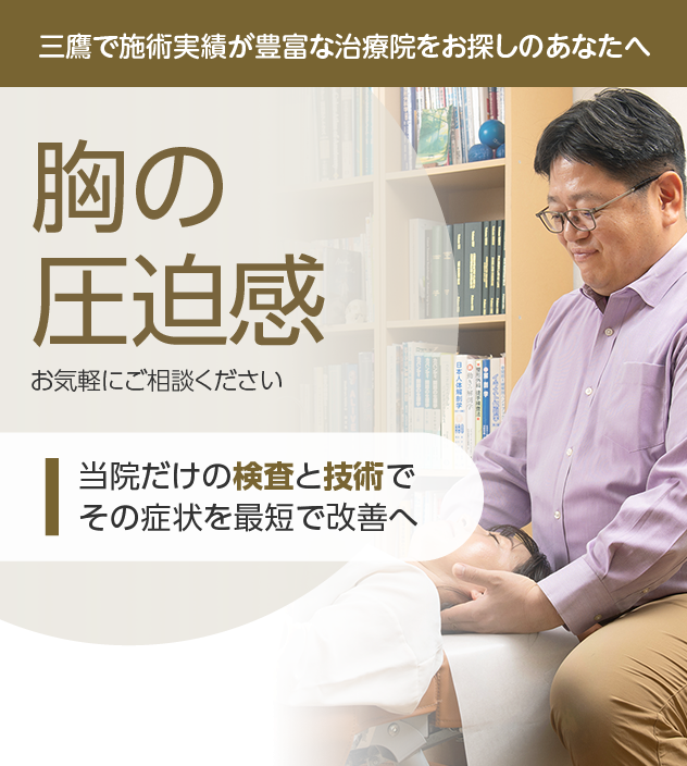 全身の姿勢と各部位の筋肉や神経の検査を行う当院のカイロプラクティックと胸の圧迫感は非常に相性がよく、劇的に改善するケースも見られます