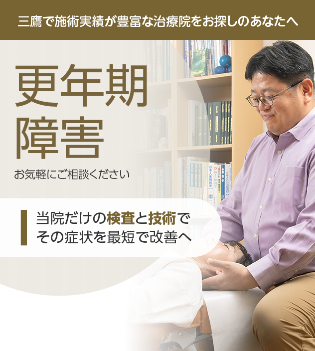 病院やほかの治療院で改善しなかったとしても諦める必要はありません。更年期障害なら、豊富な施術実績を誇る当院にお任せください。