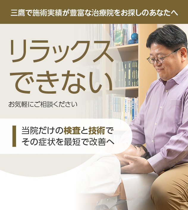 病院や他の治療院で改善しなかったとしても、諦める必要はありません。リラックスできない症状でお困りなら、豊富な施術実績を誇る当院にお任せください。